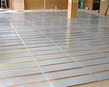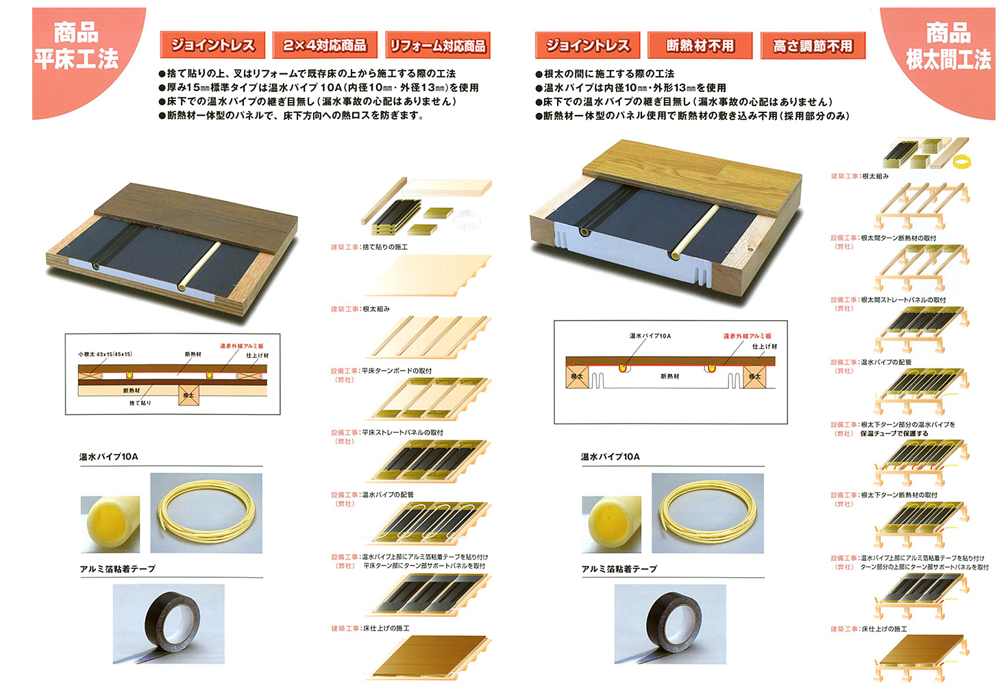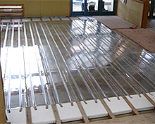 温水パネルを設置する、快適な床暖房システムです。 熱源機は条件に合わせヒートポンプ・ガス・灯油など使用できます。トラブルの出やすいジョイント部を作らない設計をいたします。